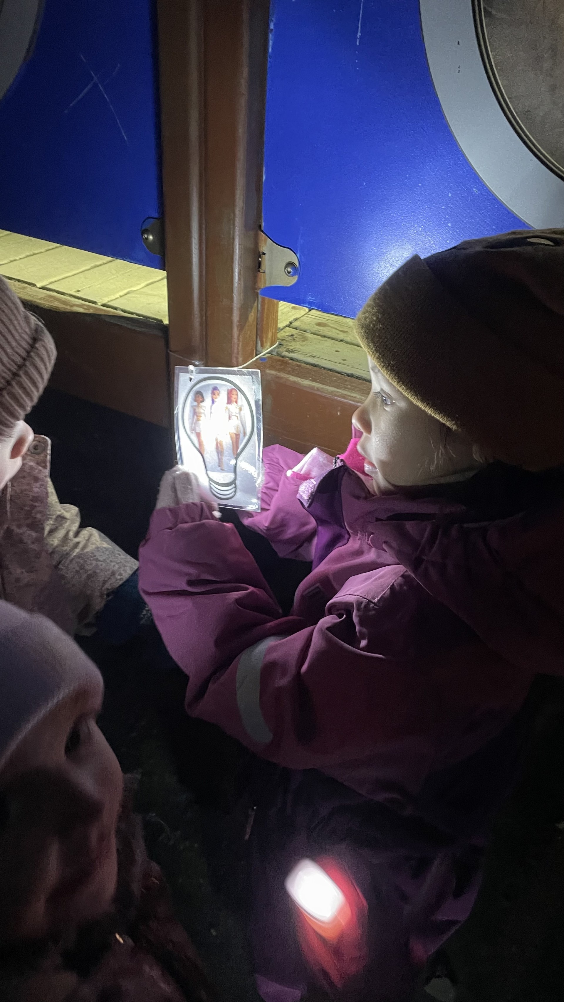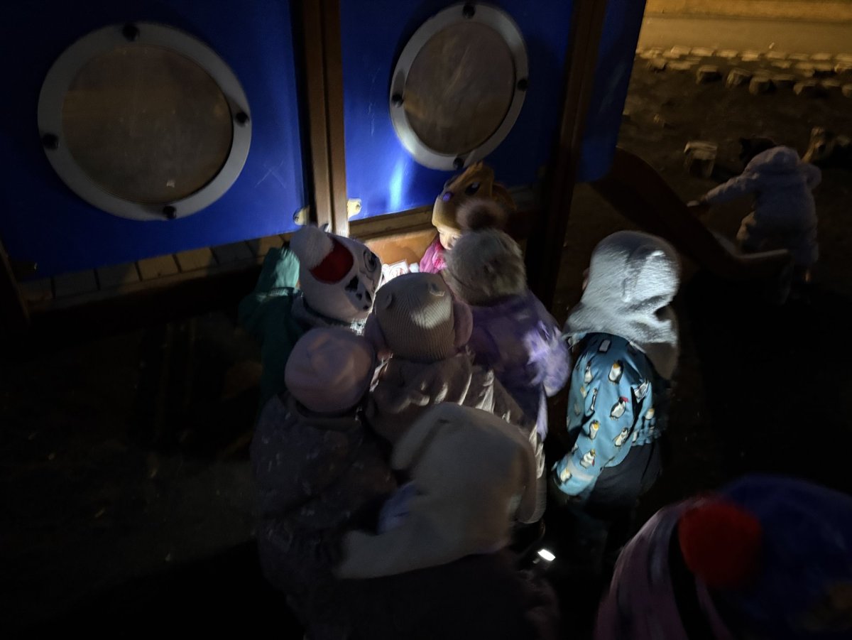 Þegar kom að útiveru hélt spennan áfram af fullum krafti. Börnin klæddu sig með hraði, gripu vasaljósin sín og héldu út í janúarmyrkrið. Búið var að undirbúa útisvæðið með því að fela fjölmörg endurskinsmerki og leynilegar myndir víðs vegar um svæðið. Myndirnar voru sérstaklega skemmtilegar þar sem þær birtust aðeins þegar börnin lýstu bak við þær.