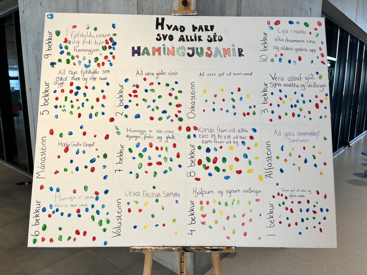 Alla vikuna hafa nemendur á leik- og grunnskólastigi unnið með spurninguna: Hvað þarf til svo allir séu hamingjusamir? Þegar hver aldurshópur fyrir sig hafði fundið sameiginlegt svar var það ritað á stóran striga. Nemendur undirrituðu svo með fingrafari sínu.