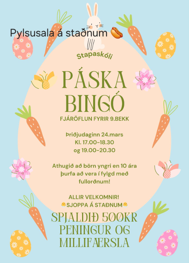 Sökum þess verður páskabingó þriðjudaginn 24. mars fyrir börnin ykkur og að sjálfsögðu ykkur líka. Veglegir vinningar hjá okkur, meðal annars páskaegg, gjafabréf frá Flugger, Líkama og boost, Skopp, Húsdýragarðinum, Orkustöðinni, Marion, Fjórhjólaævintýri, Neskju og fleira.