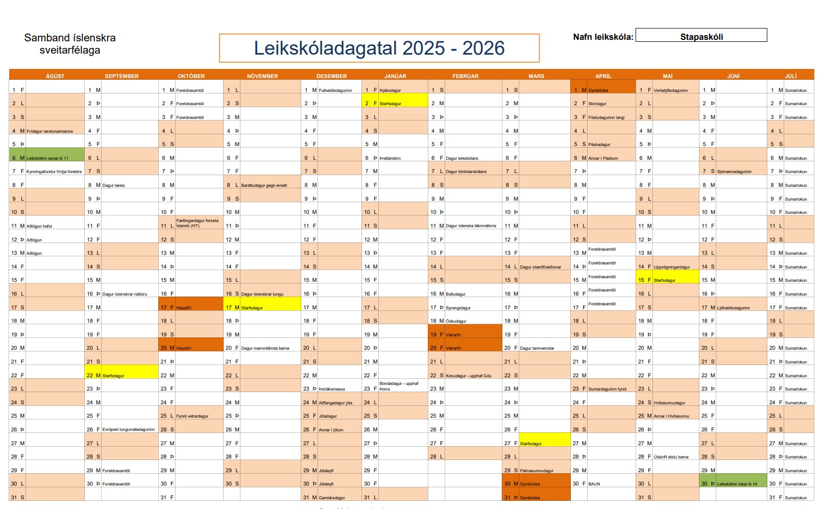 Appelsínugulir dagar eru haust- og vetrarfrí og þá er skólinn lokaður.
